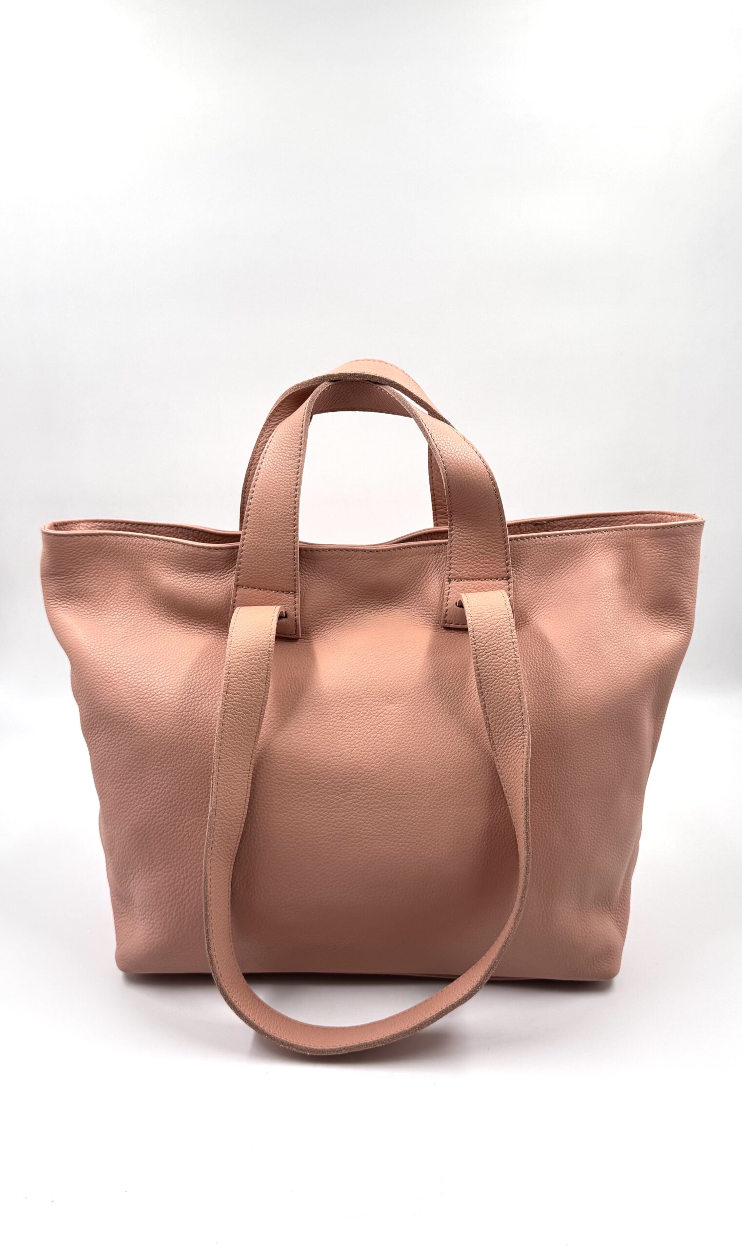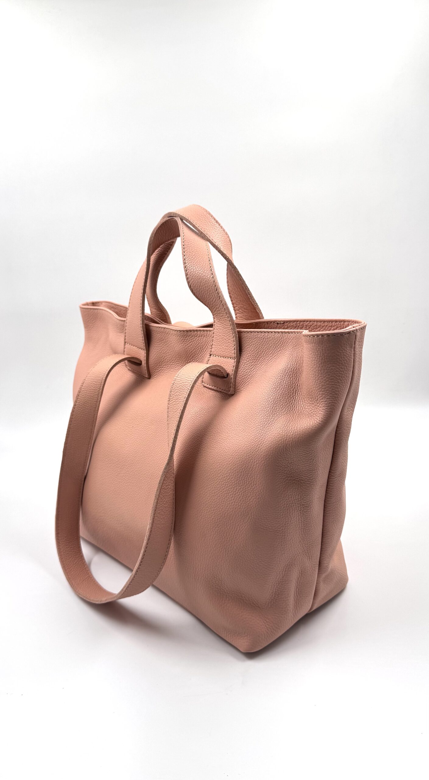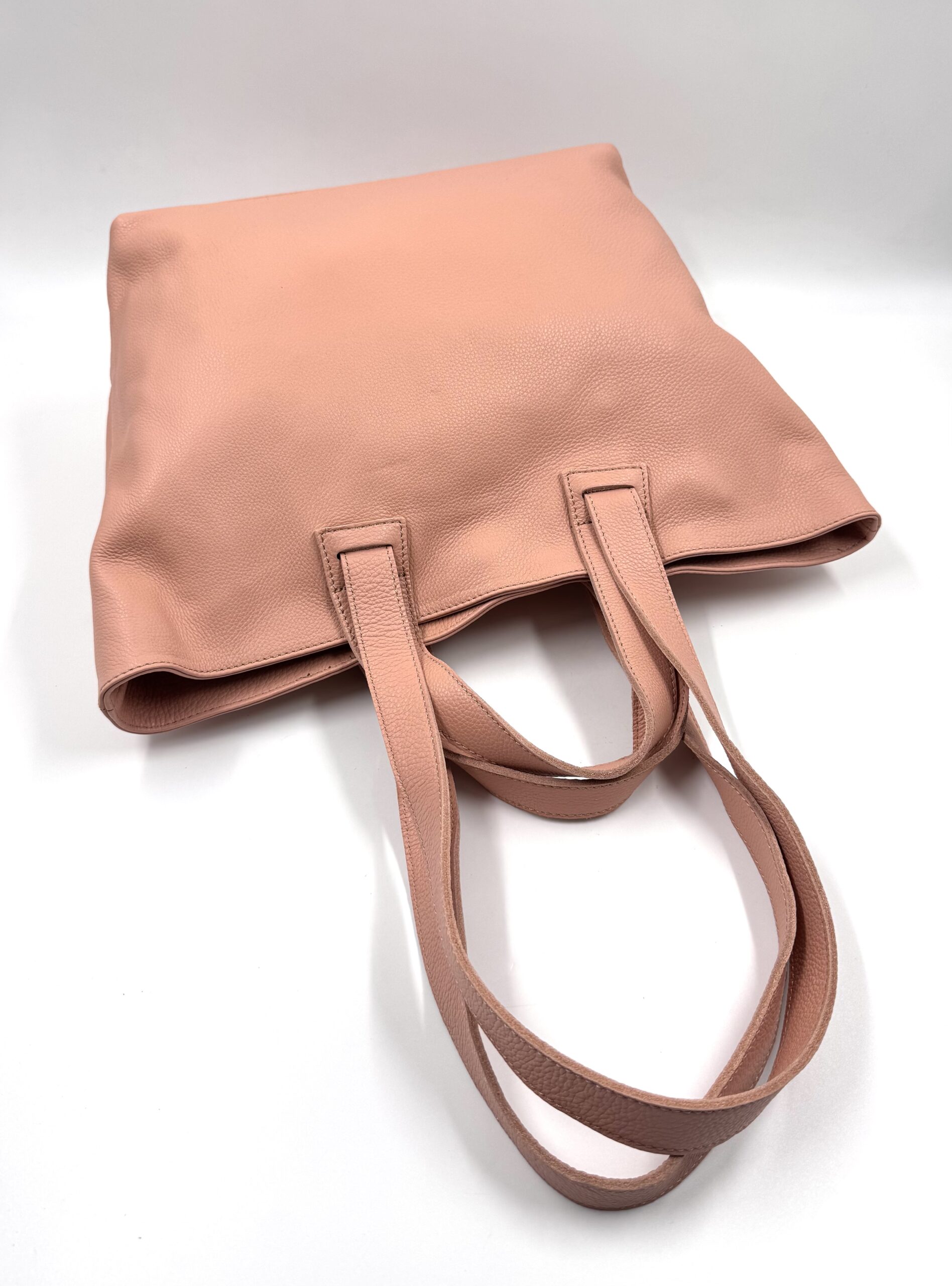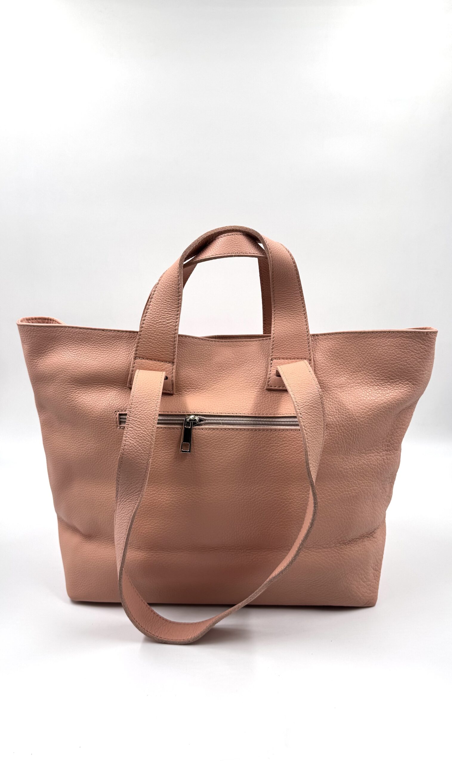 Страхотна голяма дамска чанта от естествена кожа в розов цвят.