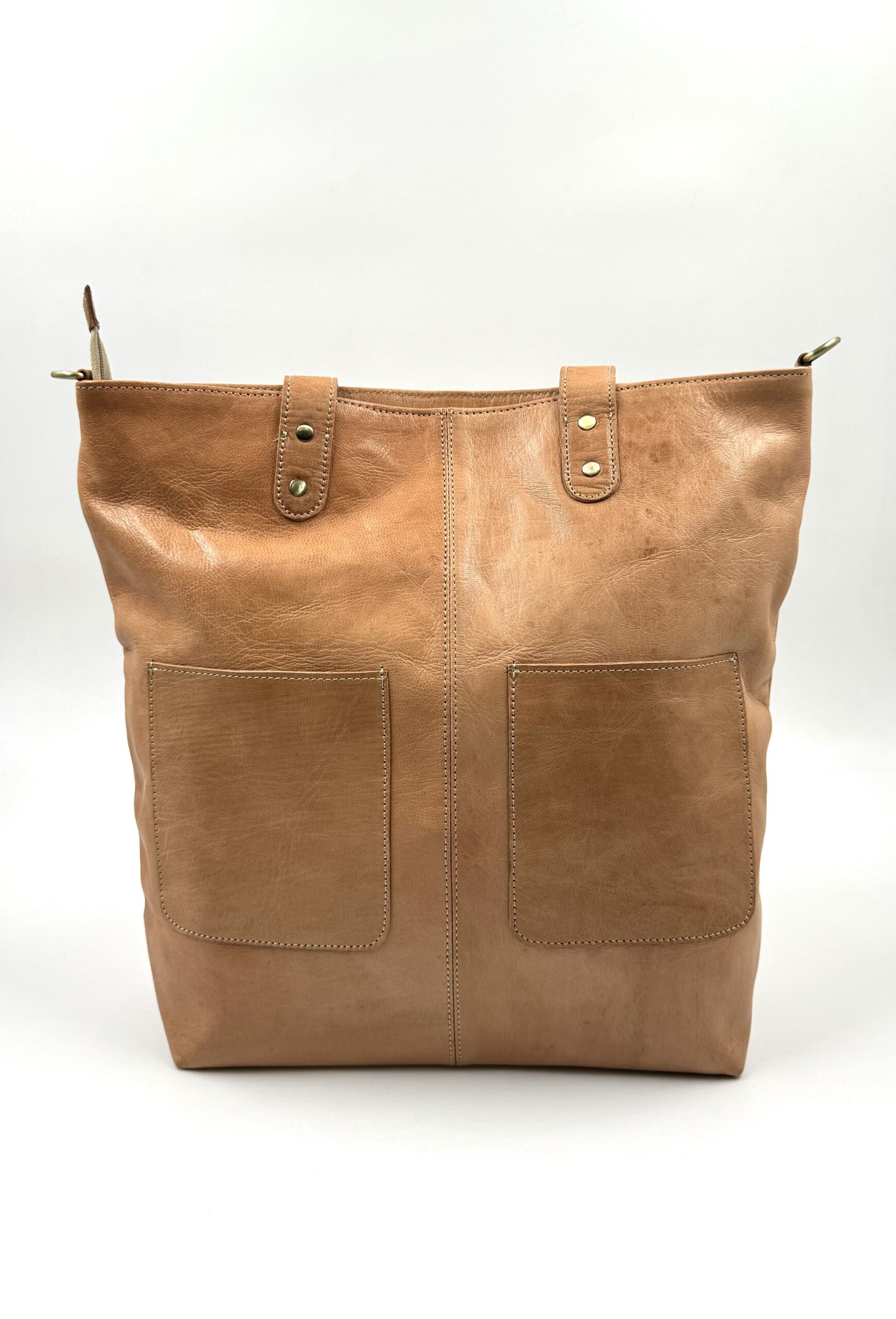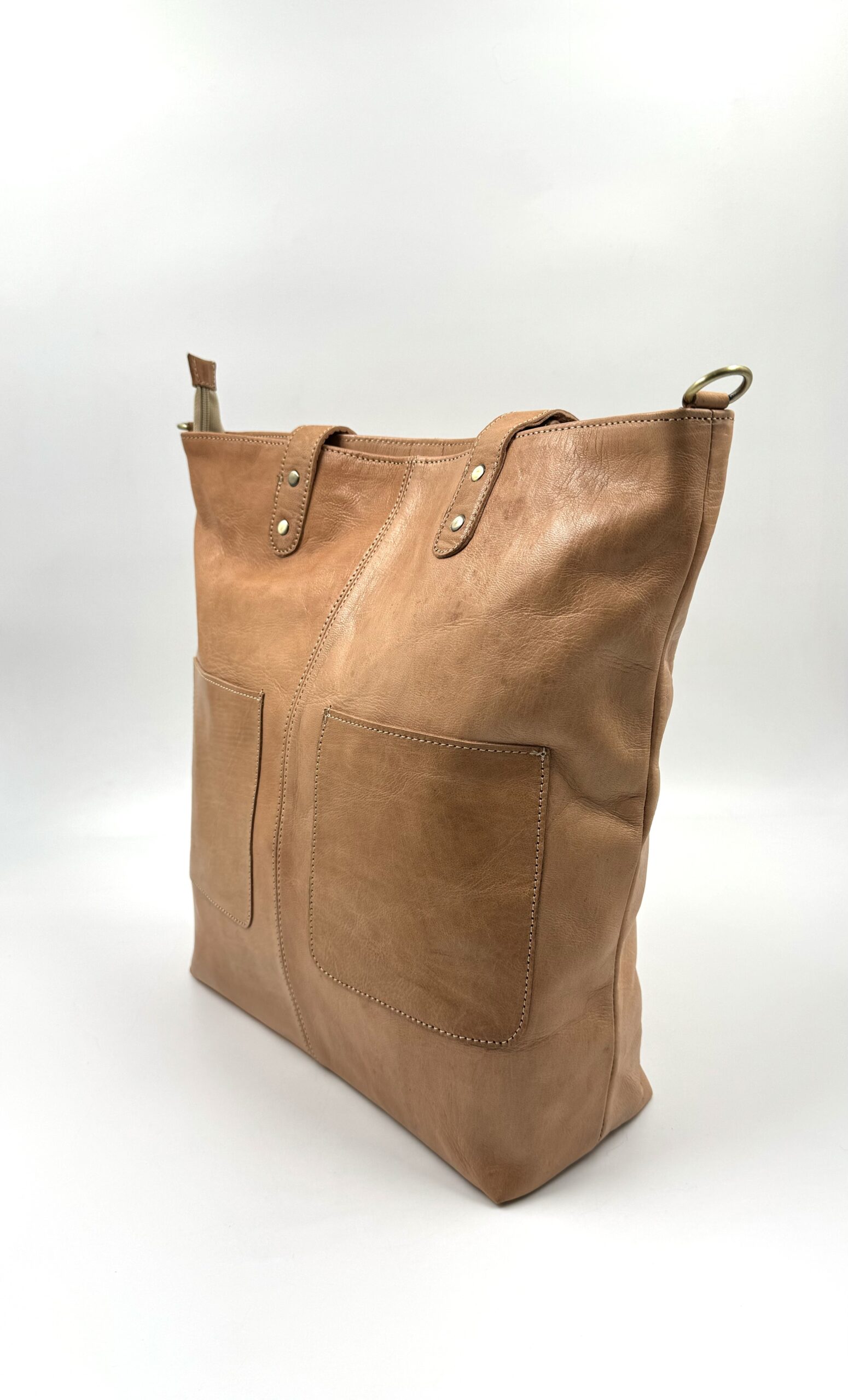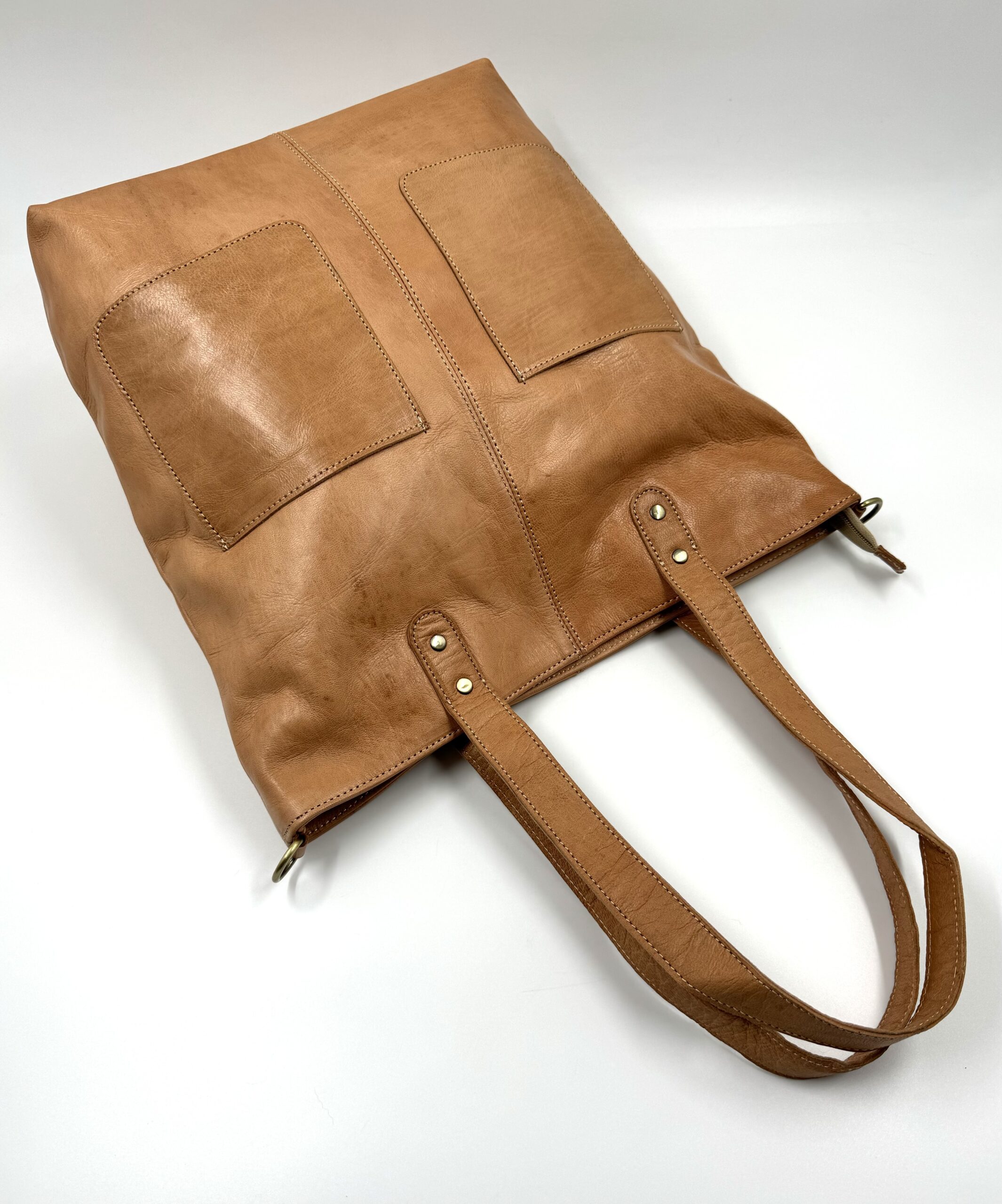 Винтидж дамска чанта с външни джобове от естествена кожа в натурално кафяво.