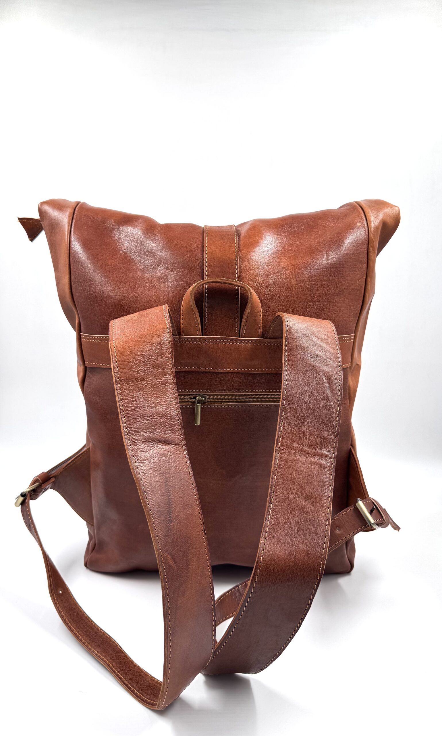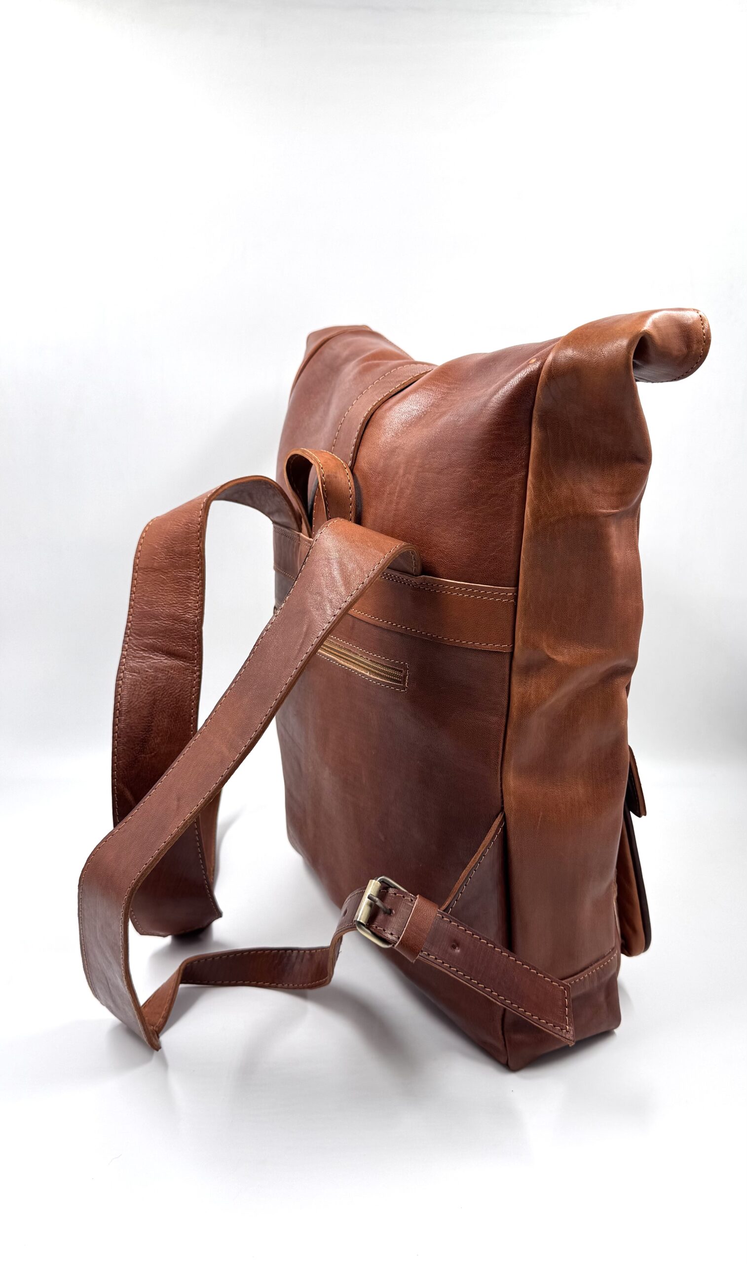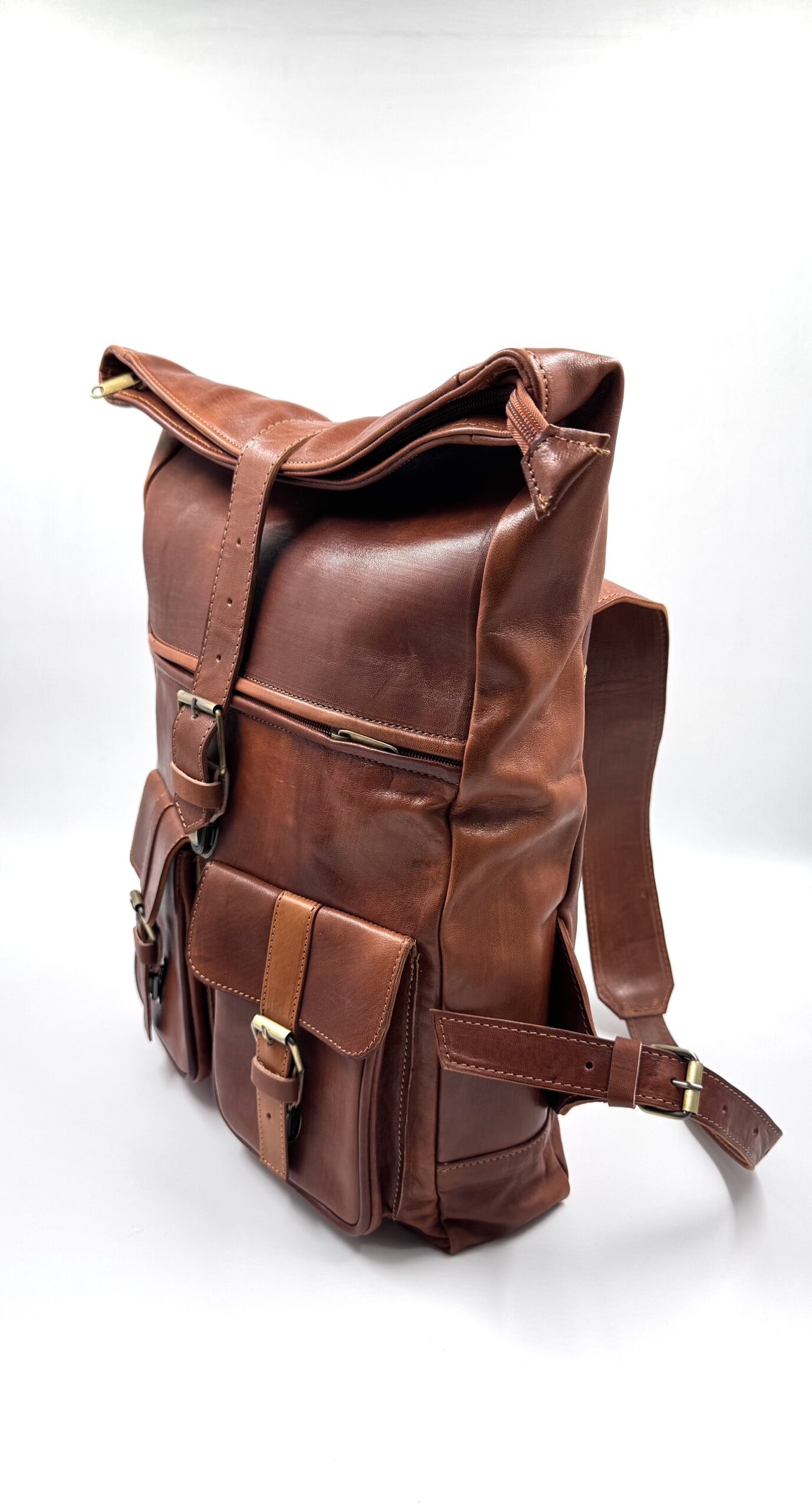Страхотна голяма унисекс раница от естествена кожа тип ролка в кафяв цвят.