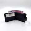 Портфейла разполага с две отделения за банкноти, 8 слота за карти или лични документи и още четири джоба.
