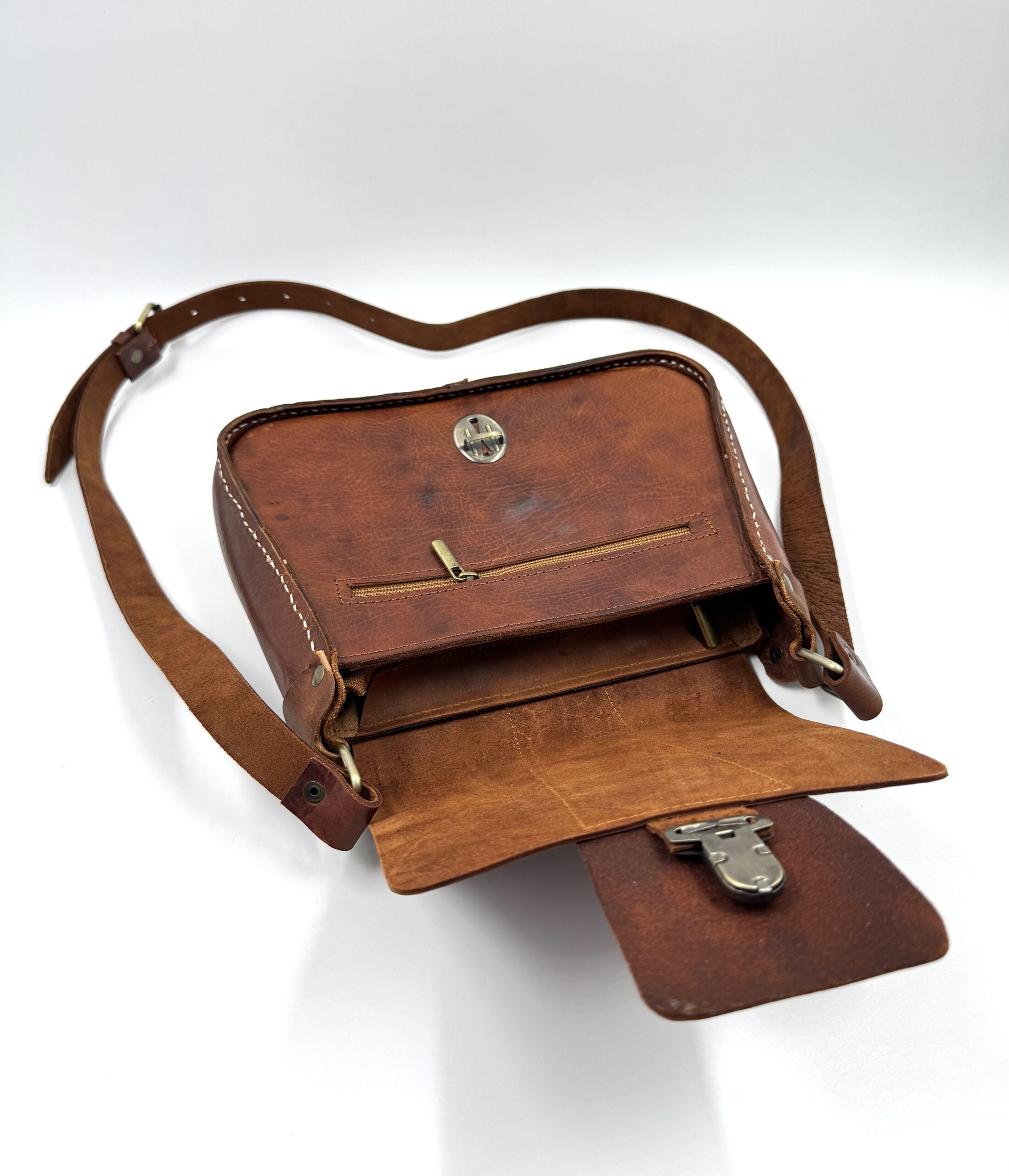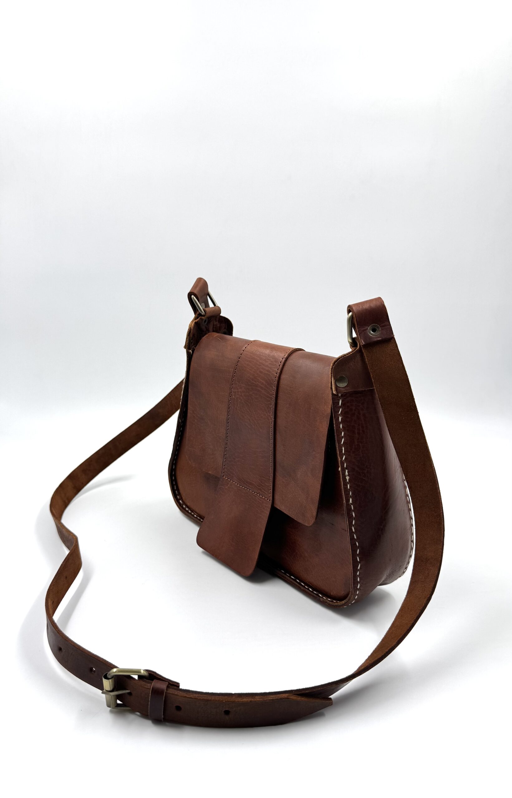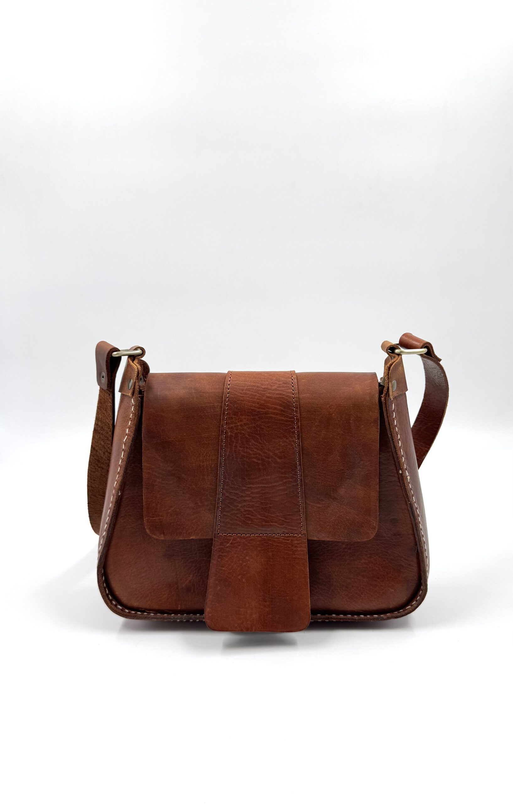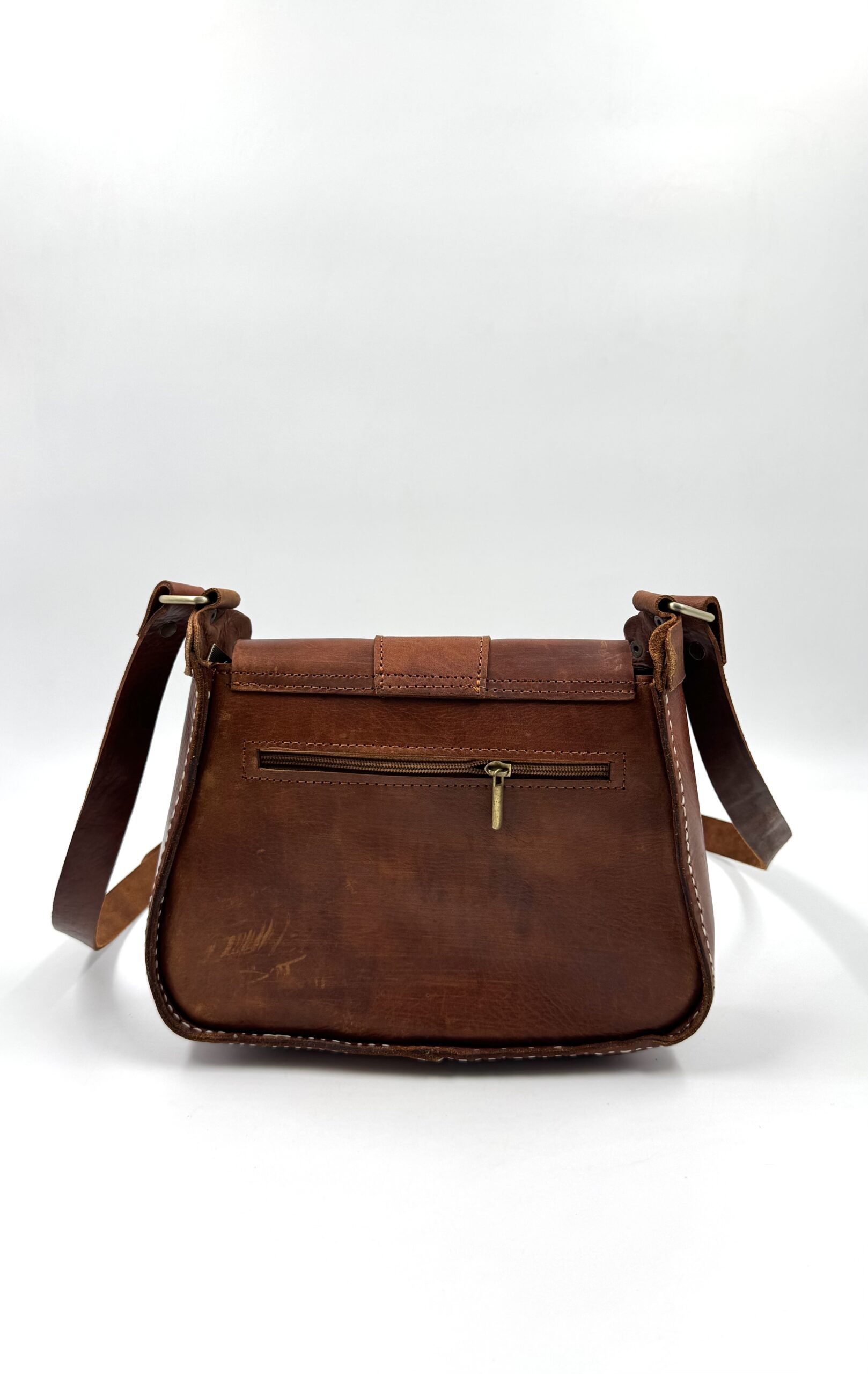 Артистична мароканска чанта от естествена кожа в кафяв цвят.