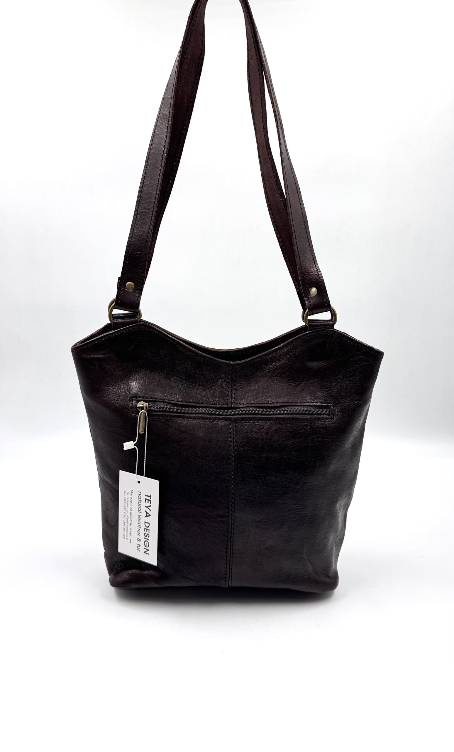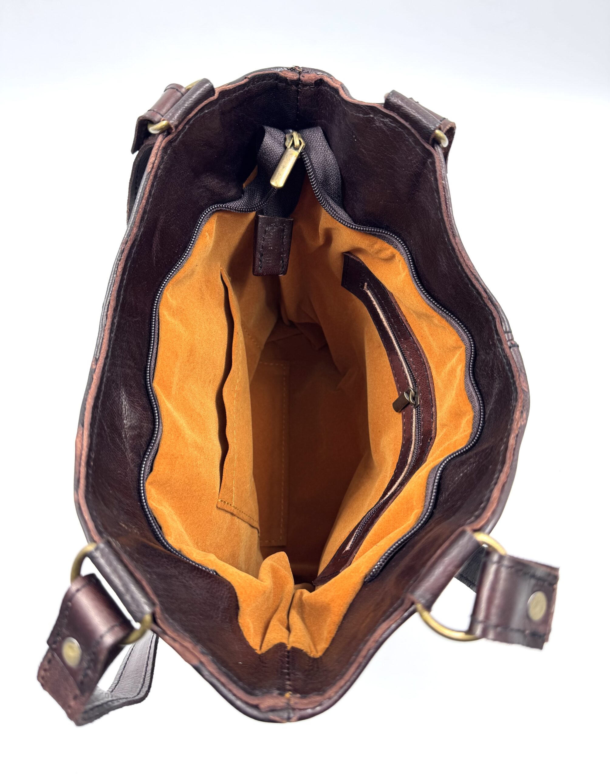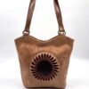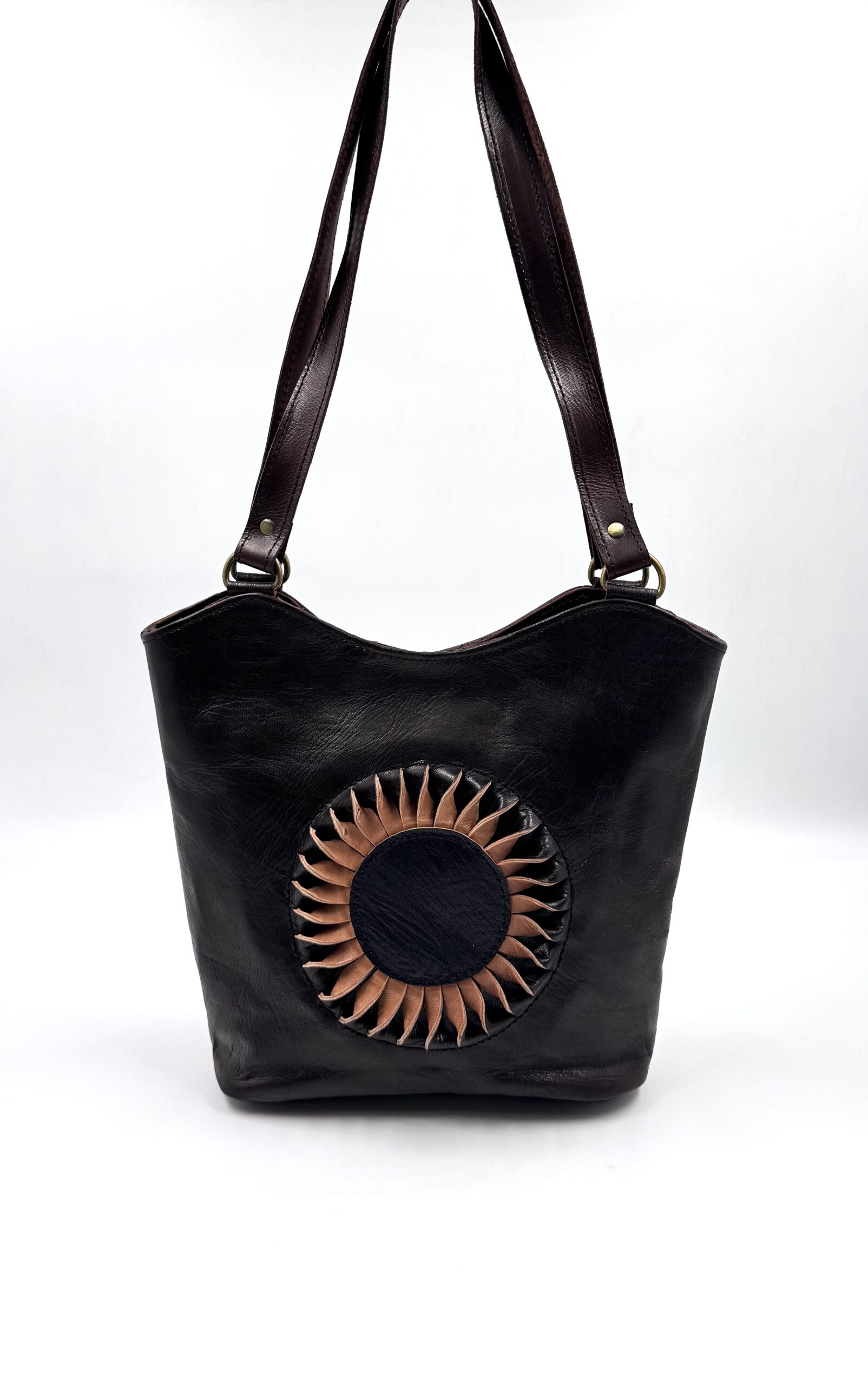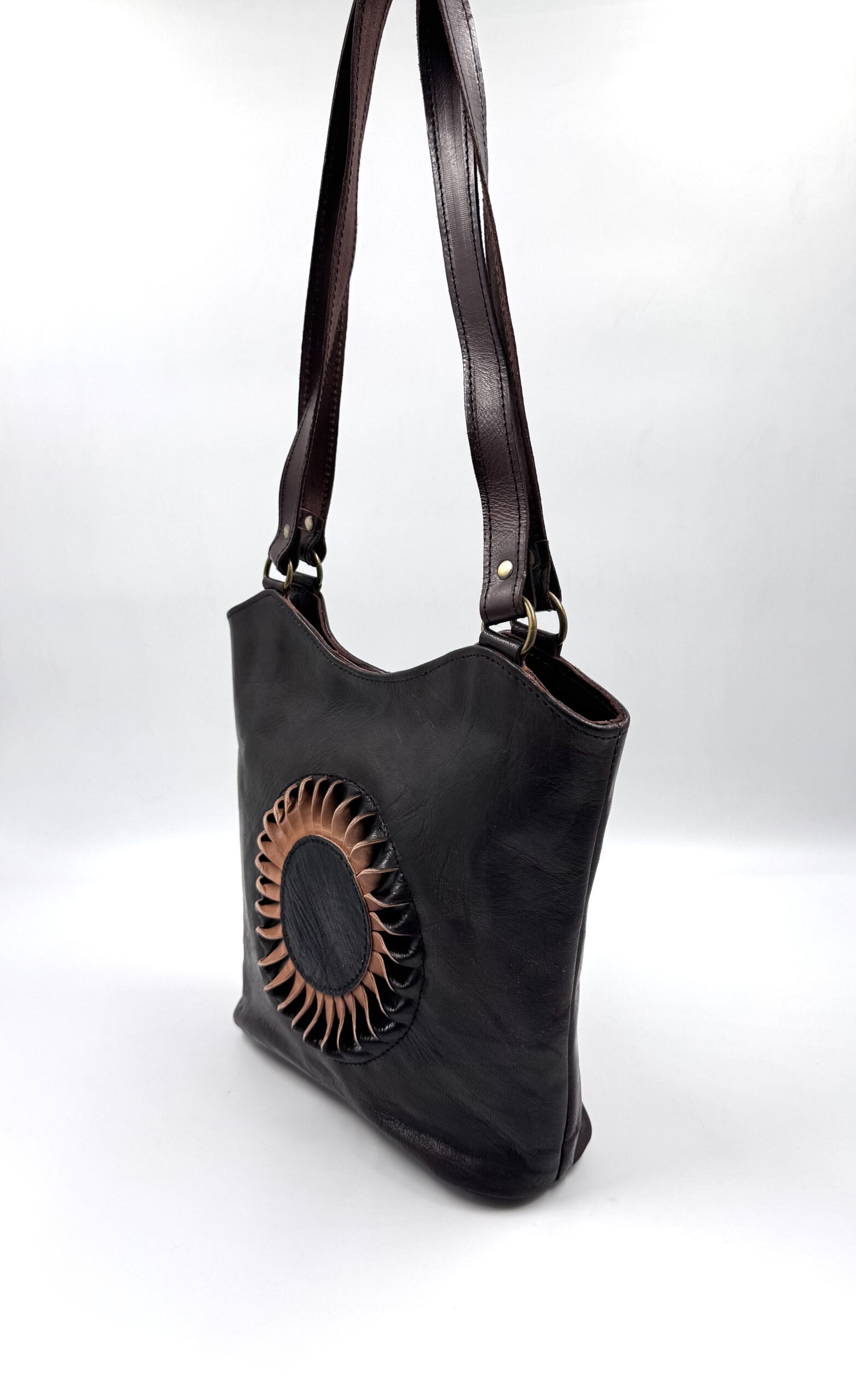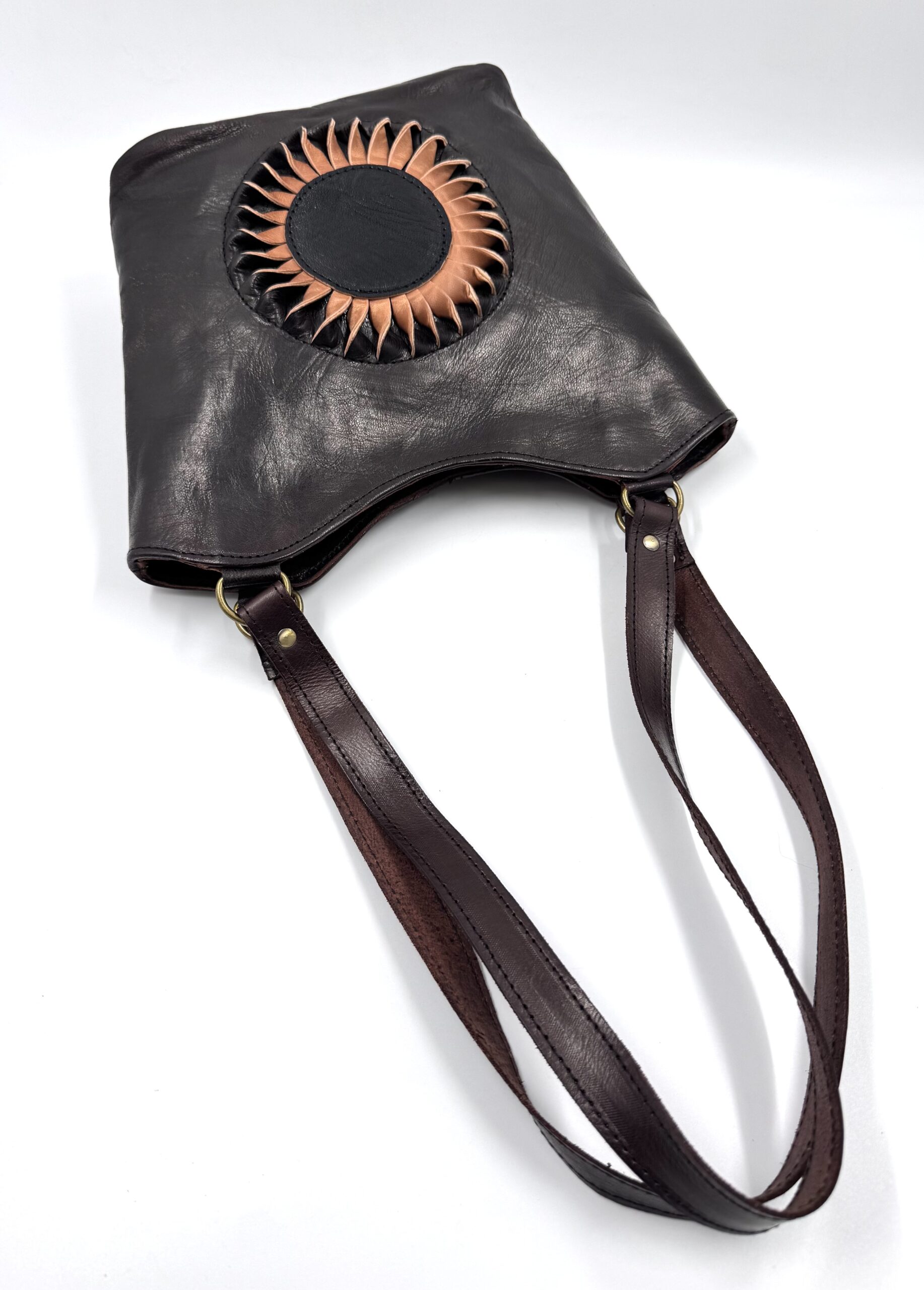 Средноголяма дамска чанта със слънце от естествена кожа в тъмнокафяв цвят.