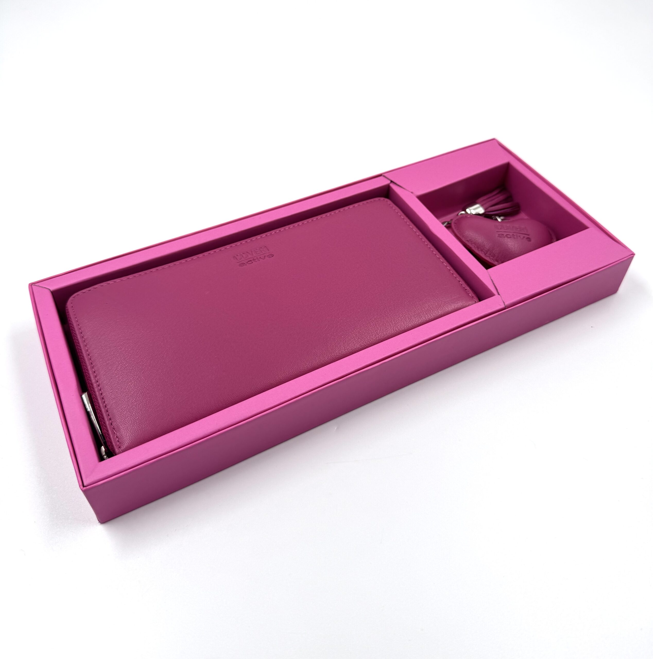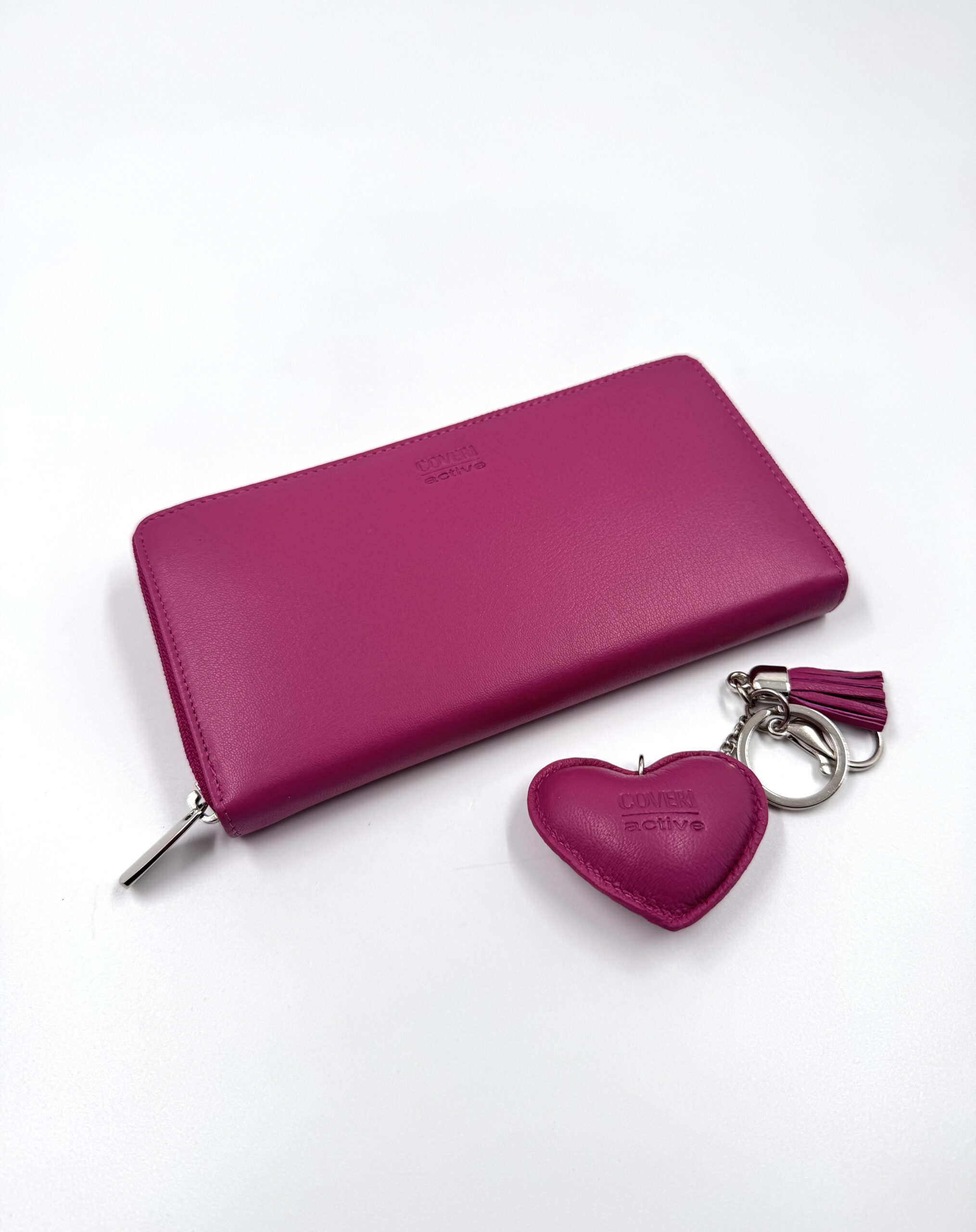 Голям дамски портфейл в комбинация с ключодържател от естествена кожа в цвят фуксия.