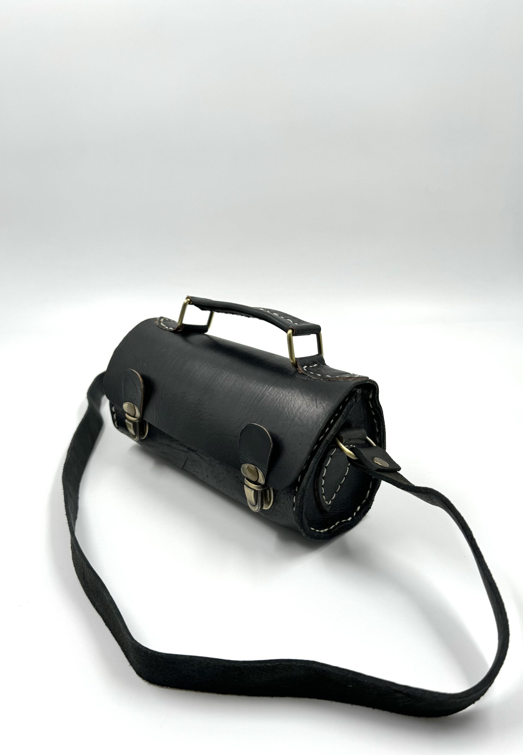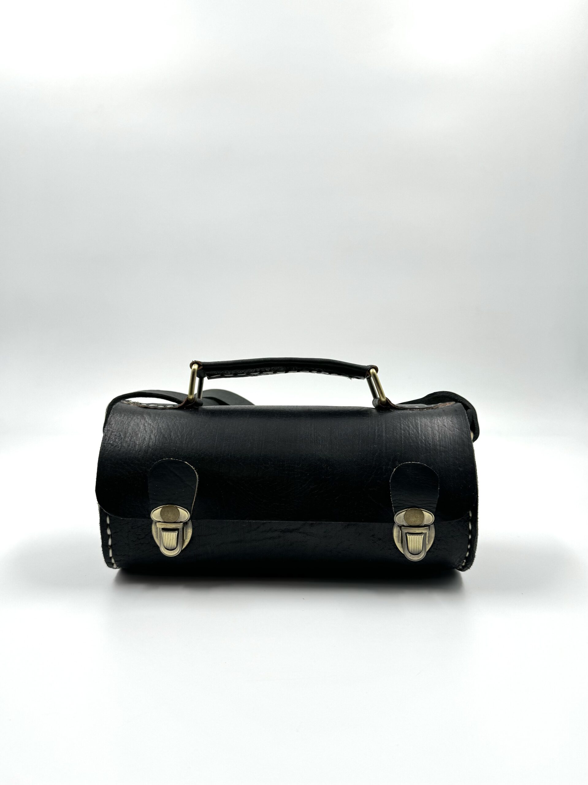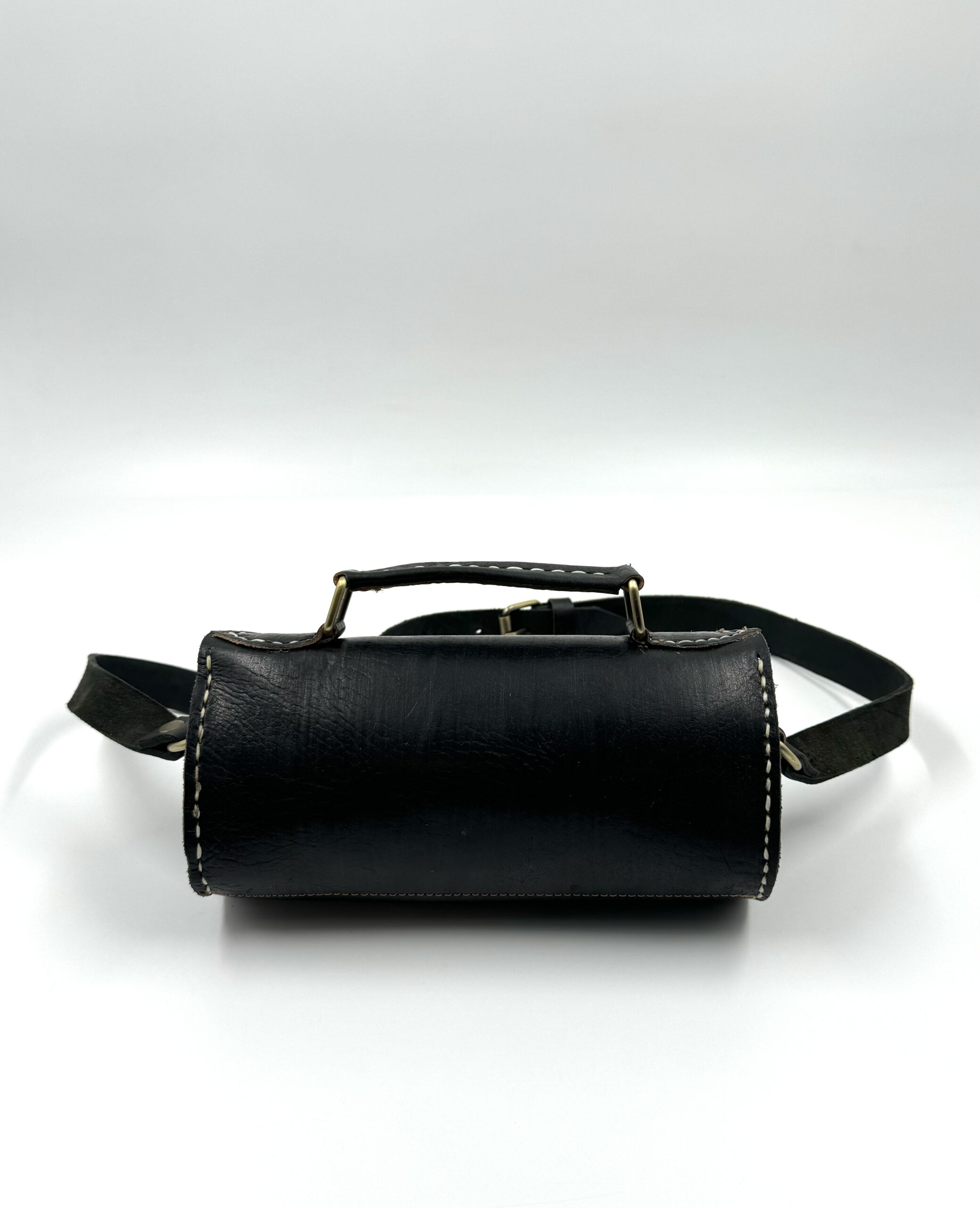 Уникална кръгла дамска чанта от естествена кожа в черен цвят.