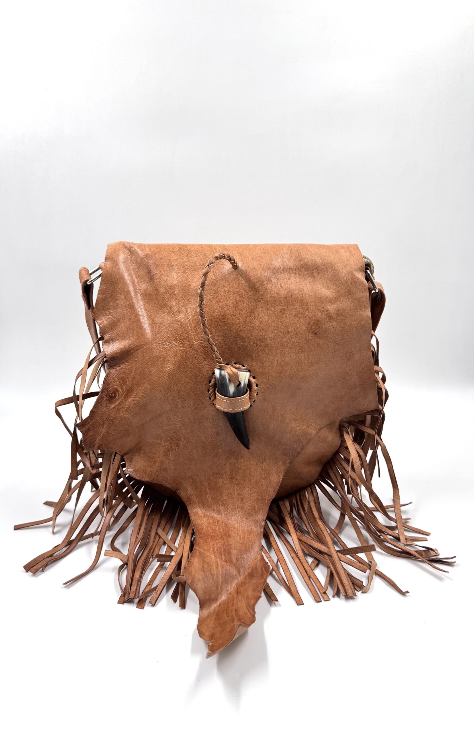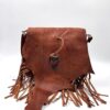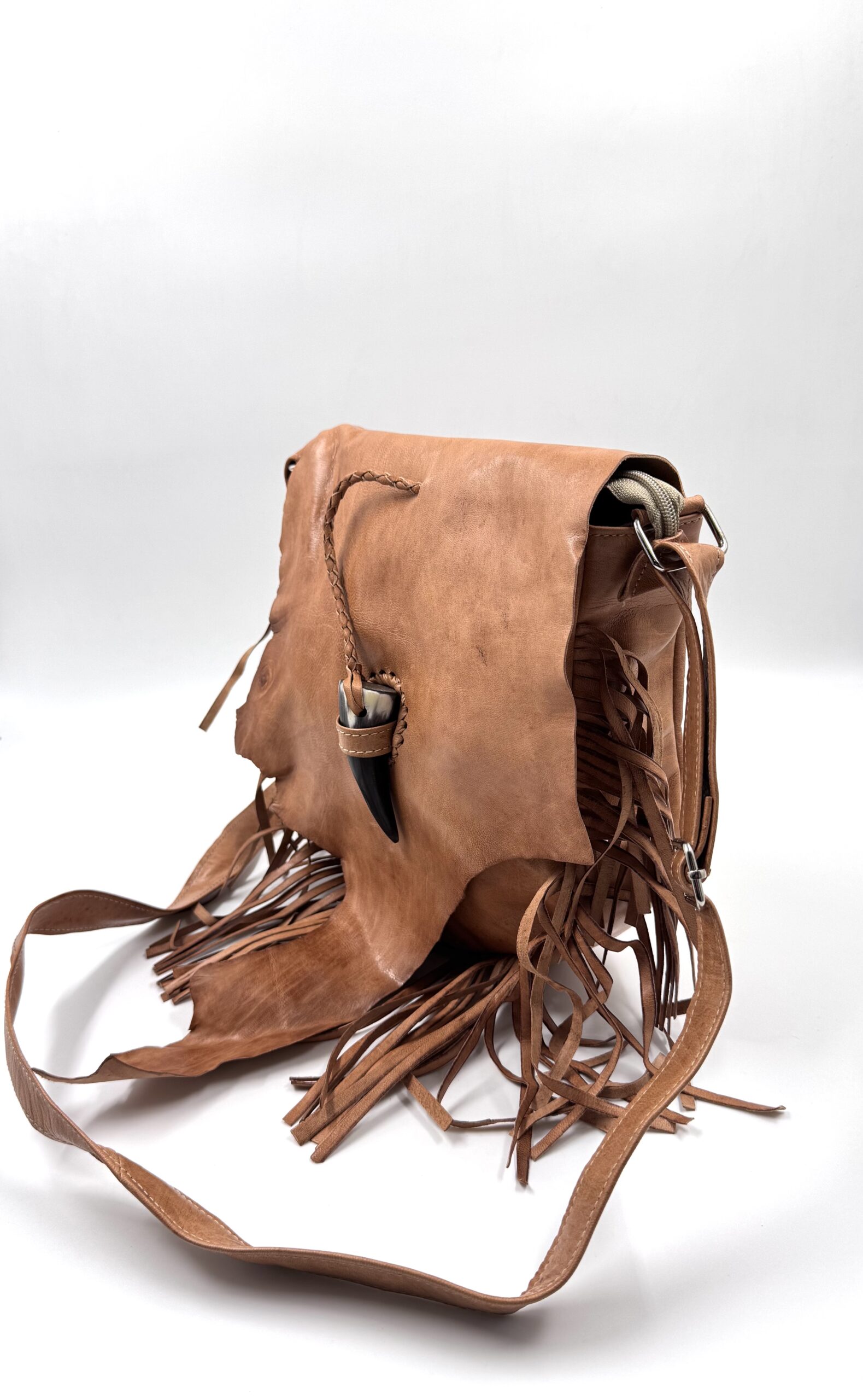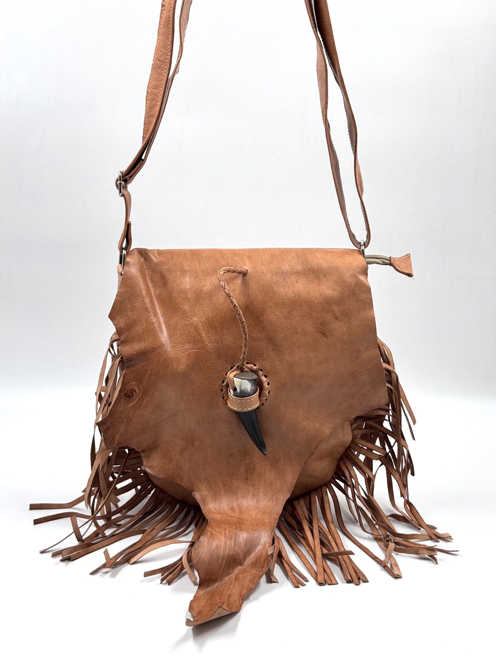 Уникална чанта с ресни от естествена кожа листо и рог в натурално кафяв цвят.