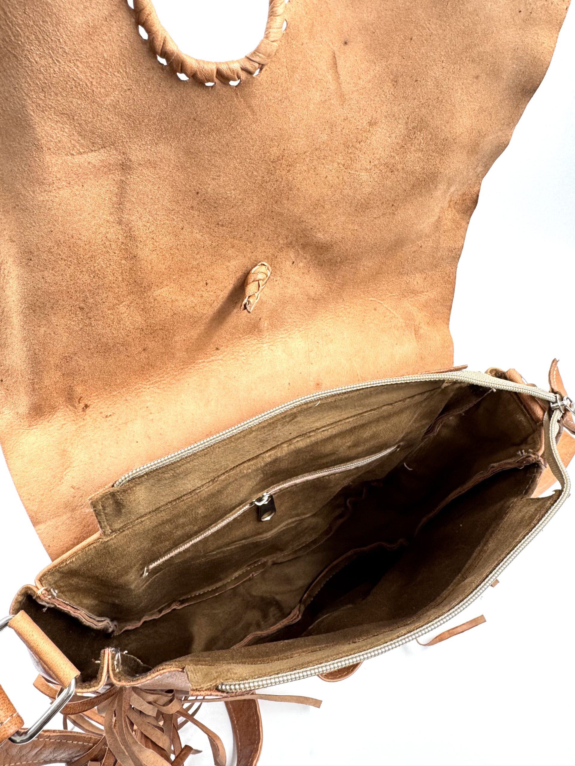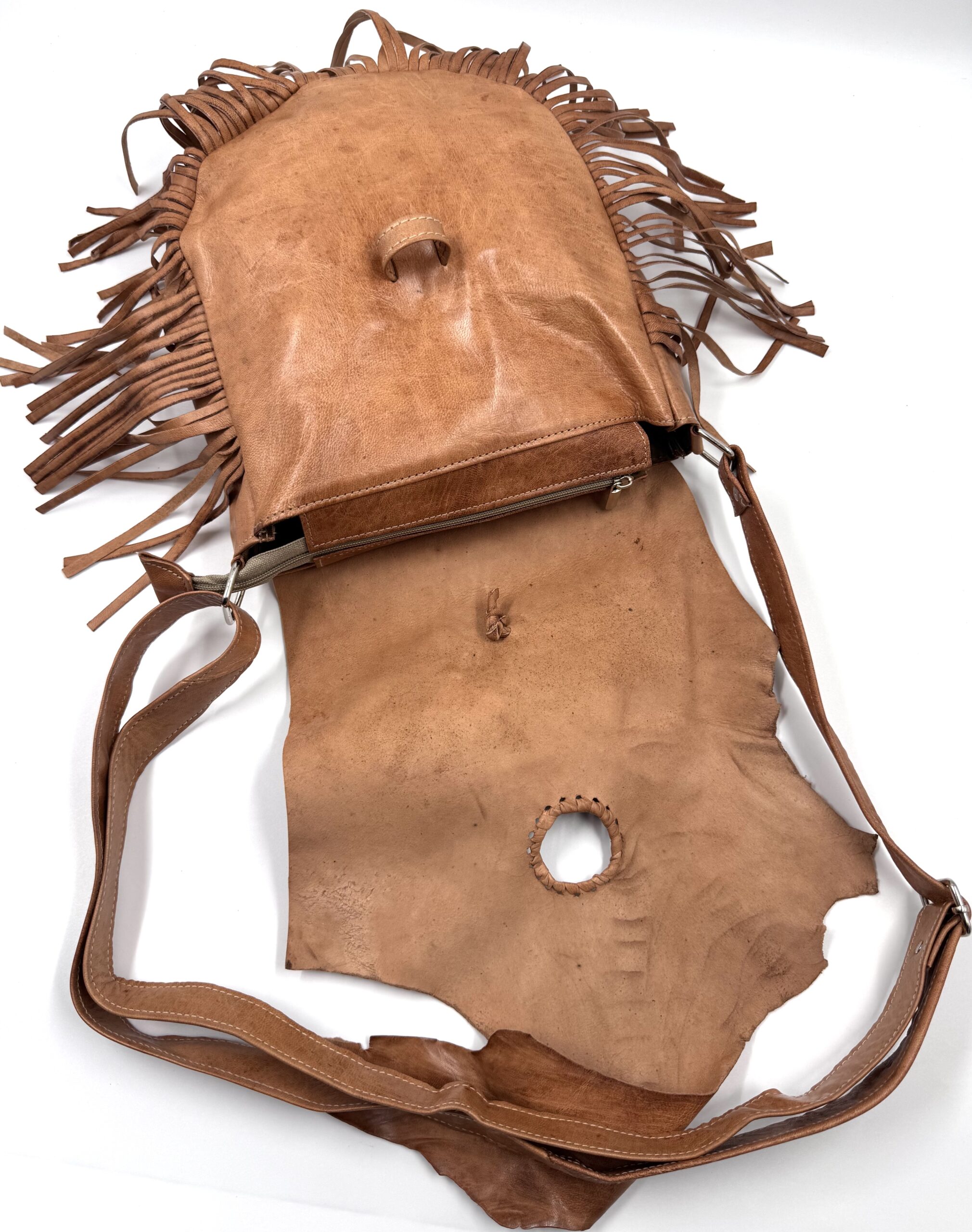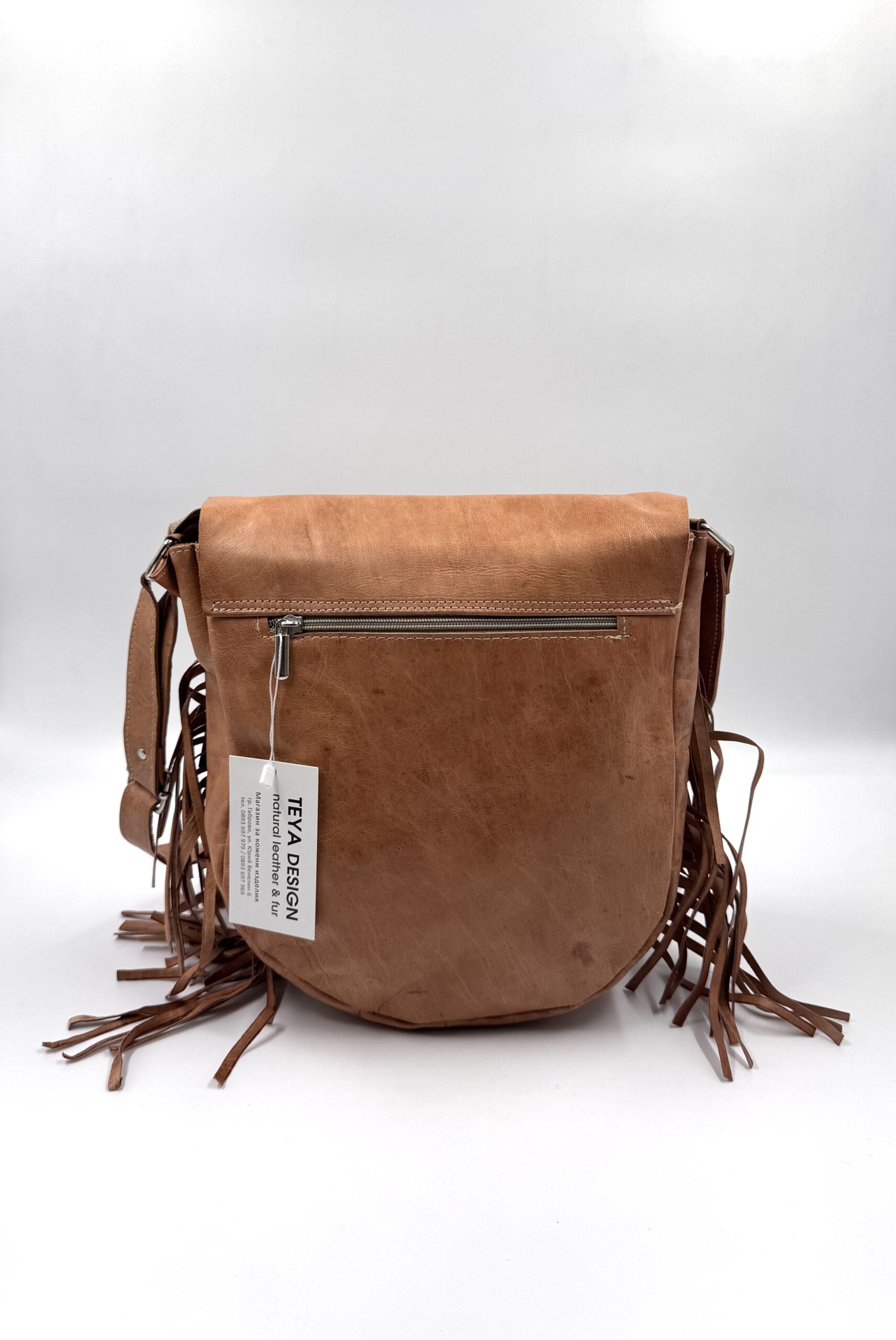 Уникална чанта с ресни от естествена кожа листо и рог в натурално кафяв цвят.