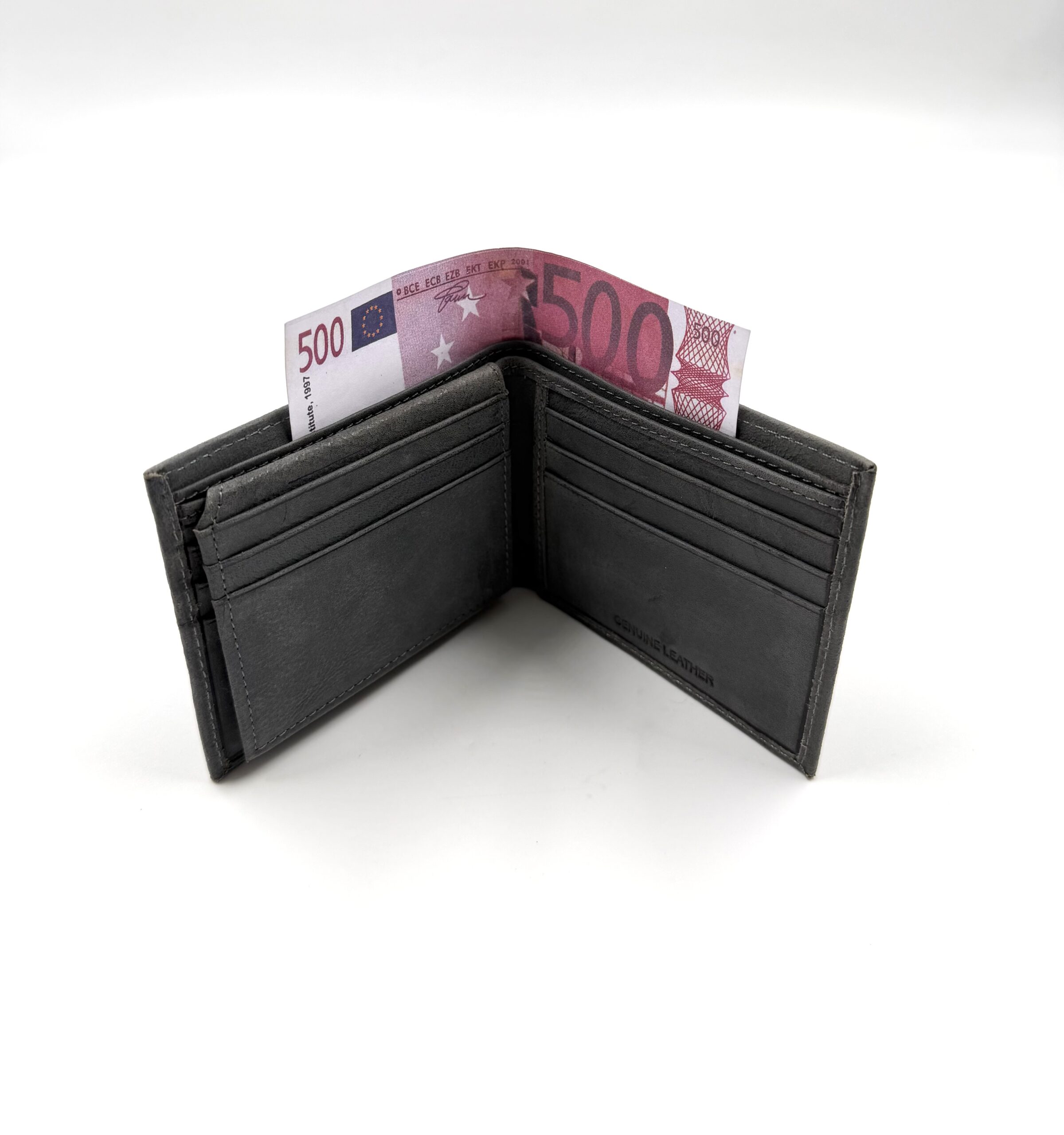 Портфейла разполага с две отделения за банкноти и 10 отделения за карти.